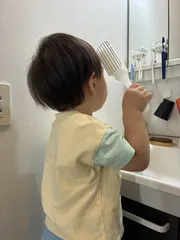 寝癖はなかなかつきません。笑 ママが毎朝寝癖をなおしたり、お化粧をしていると必ずやってくる息子。笑 今日は珍しく寝癖があったけど、くしでとかすと一発、すぐなおった。 同じように髪の毛をといて、満足してます。笑 まだまだ髪の毛少ないから、なかなか寝癖つかないのよね…笑